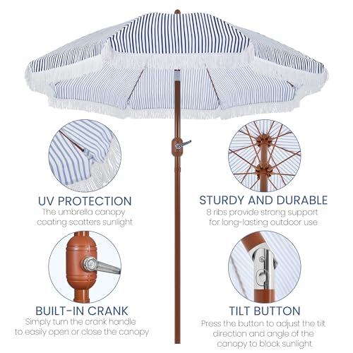 Yaheetech Romantischer Quasten Sonnenschirm Ø 215 cm Klappbarer Gartenschirm 8-Glasfaserrippen-Schirm mit Fransen Kurbelschirm Schirm Sonnenschutz Terrassenschirm, UV-Schutz, ohne Ständer, Blau & Weiß