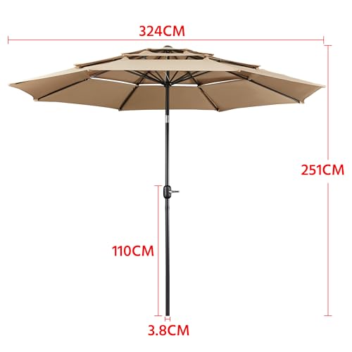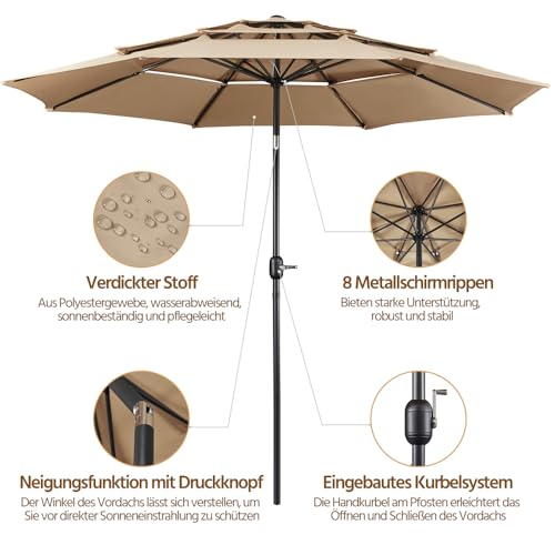 Yaheetech Sonnenschirm mit 3-lagigem Dach Φ 324 cm Neigbarer Gartenschirm UV-Schutz belüftet Marktschirm Outdoor Schirm Rund Sonnenschutz für Garten/Balkon/Terrasse/Strand, Hellbraun