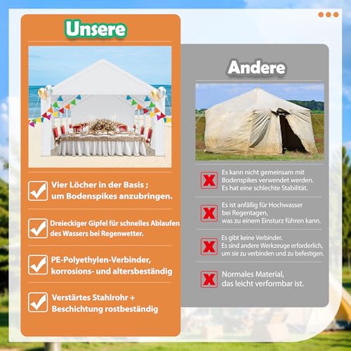 Premium-Materialien:Langlebiges Festzelt für Jahre voller Events!Investition statt Wegwerfware: Das 170g/m² PE-Dach und die feuerverzinkten Stahlrohre überzeugen durch extreme Haltbarkeit. Die reißfeste Beschichtung widersteht Hagel, UV-Strahlen und Salzwasser – perfekt für Küstenfeste oder Dauerregen. Selbst bei häufiger Nutzung bleibt das Zelt formstabil und optisch ansehnlich. Ihr zuverlässiger Partner für Hochzeiten, Märkte und mehr