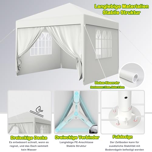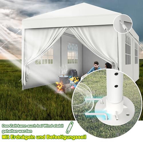 Langlebig und leistungsfähig: Das robuste Stahlgestell garantiert Langlebigkeit und Stabilität auf verschiedenen Bodenarten. Mitgelieferte Spannseile und Heringe Acht geben eine sichere Verankerung, während das Material des Dachs und der Seitenteile aus Polyethylen (PE) mit 110G/M2 für Zuverlässigkeit stehen.