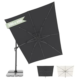 €599,95Produkt kaufenanndora Aluminium Ampelschirm 300 x 400 cm mit Kurbelsystem – Drehbar, Neigbar, Kippbar – Marktschirm, Gartenschirm – Farbe Silber Grau mit 4 Stück Granitplatten 120kg